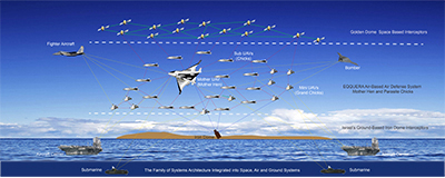 Particularly, to build a close-range defensive and offensive system architecture warfare strategy that can intercept and defeat threats that existing ground-based interceptors and the proposed space-based interceptors, the "Golden Dome," may not intercept or defend against high-volume or "super-swarms" attacks involving hundreds or thousands of UAVs and drones.